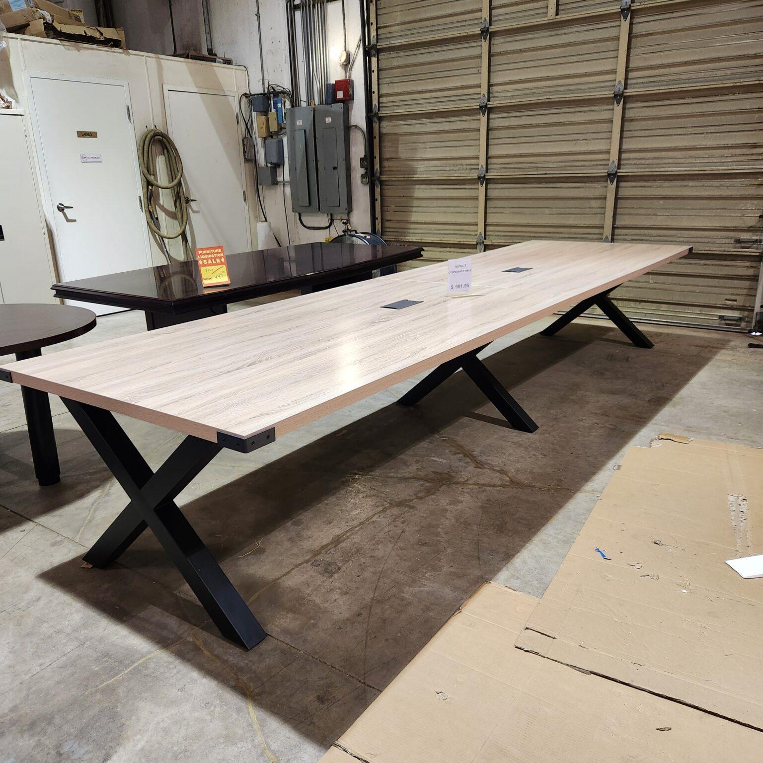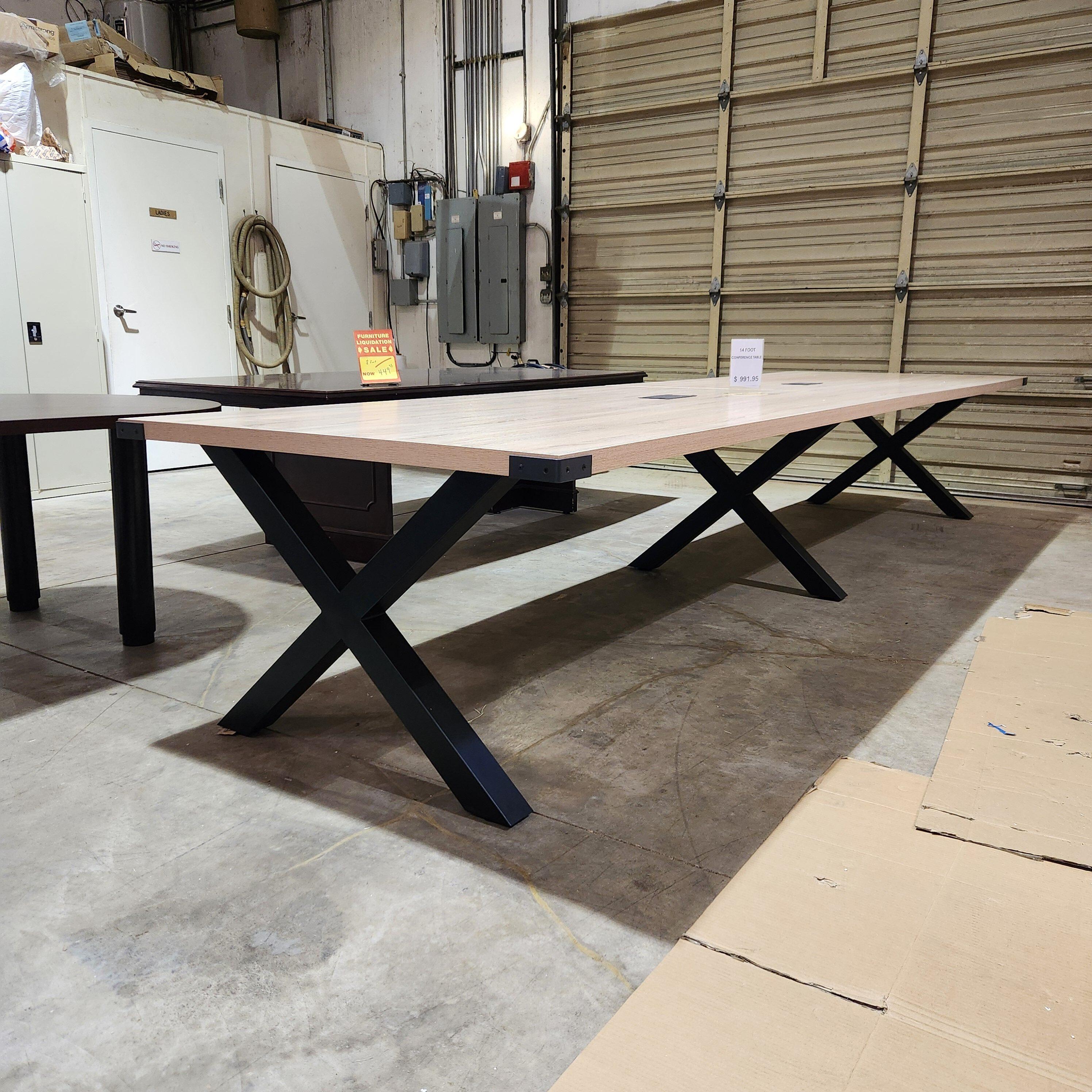 Make a bold statement in your meeting space with this 14-foot conference table featuring a light maple wood veneer laminate top and sleek black X-base legs. The expansive surface provides plenty of room for large team meetings or client presentations. Sturdy corner guards protect the edges, ensuring long-lasting durability. Functional, modern, and ready for collaboration.