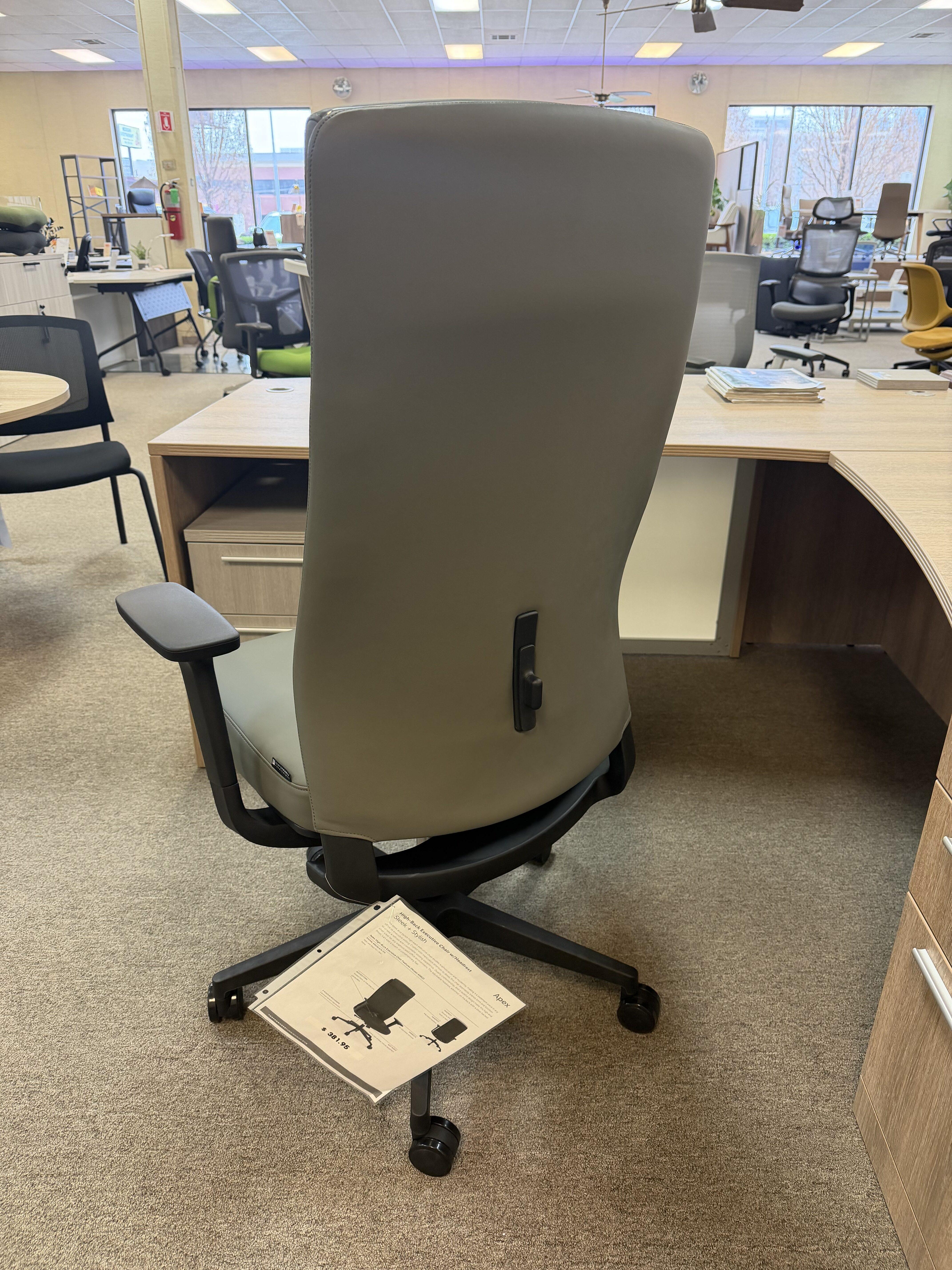 Apex Series high-back executive chair blends European style with durable design. Features adjustable headrest, antimicrobial vinyl, sleek styling, and synchro-tilt mechanism—perfect for executive offices and boardrooms.