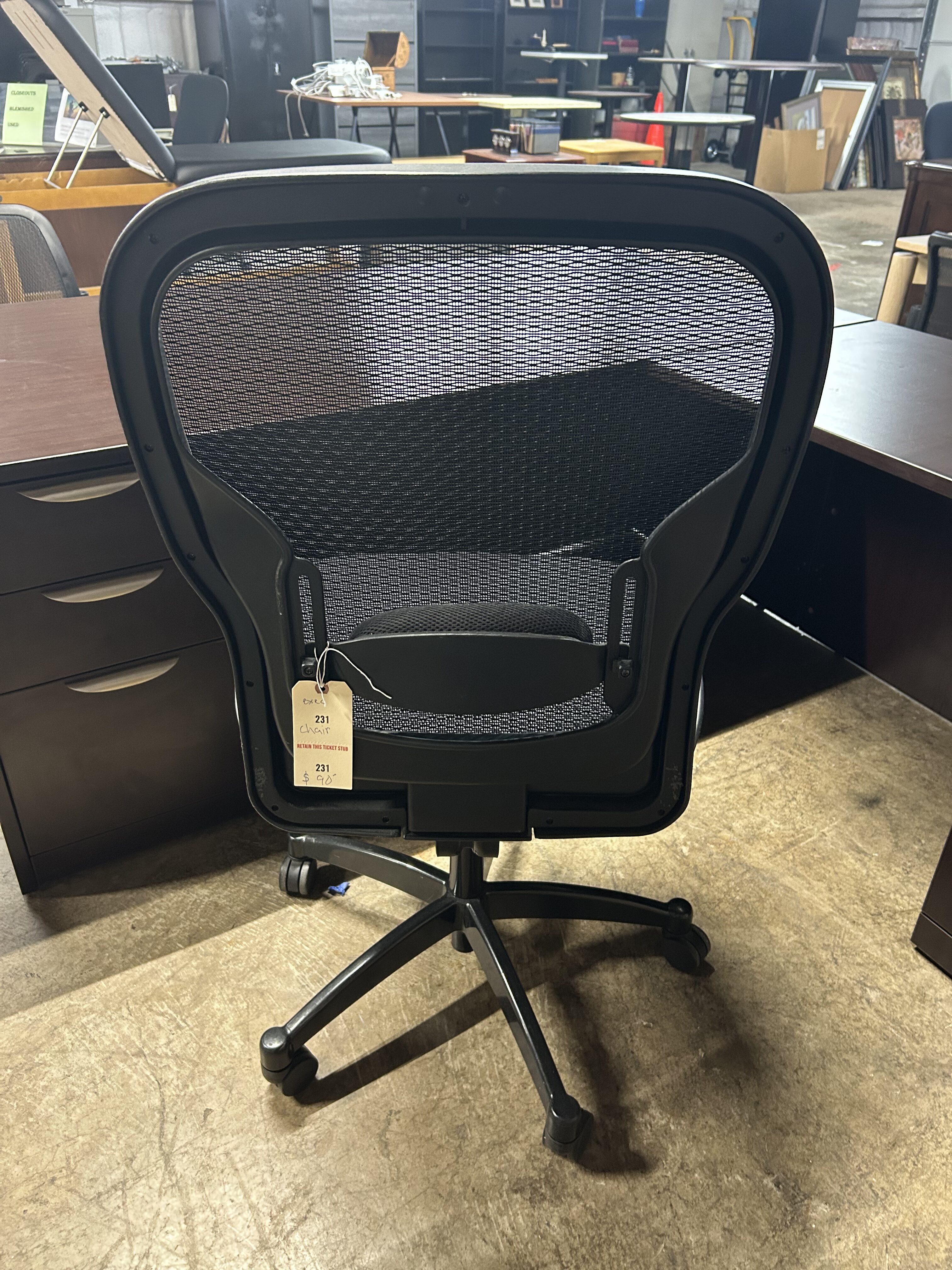 Gently used armless task chair with breathable mesh back and cushioned fabric seat with lumbar support. Compact design with casters—ideal for offices, conference rooms, or home workspaces. Â