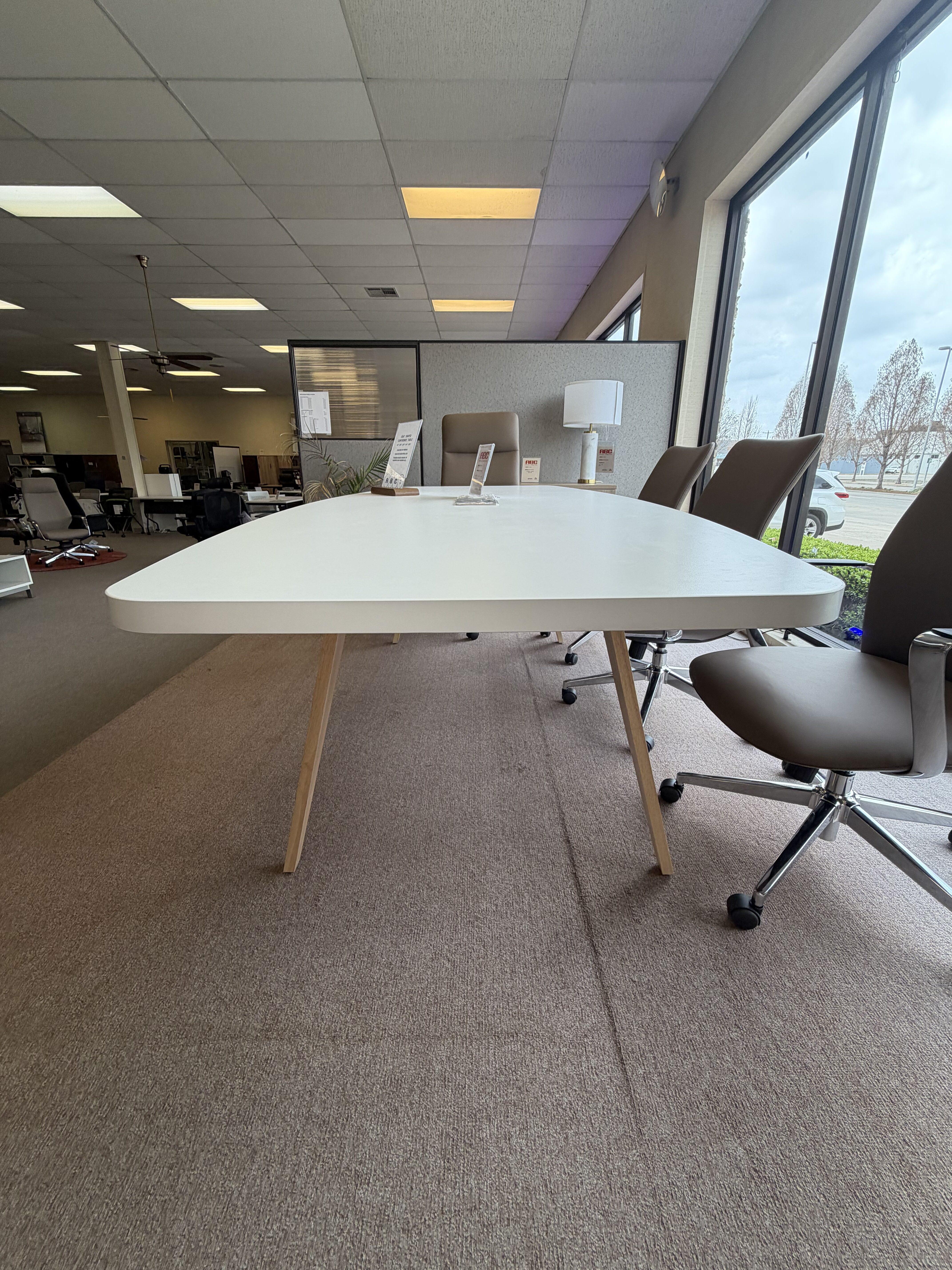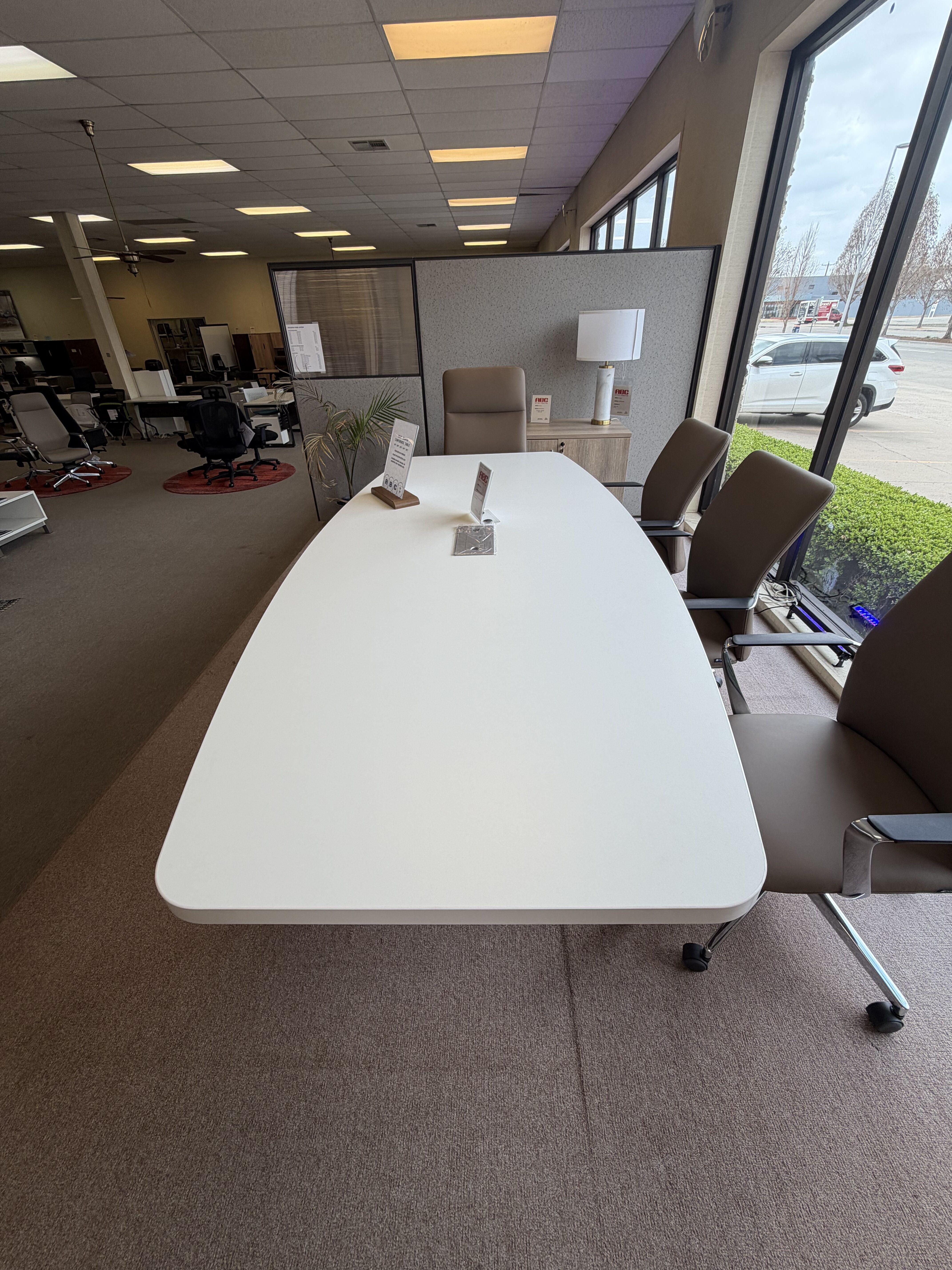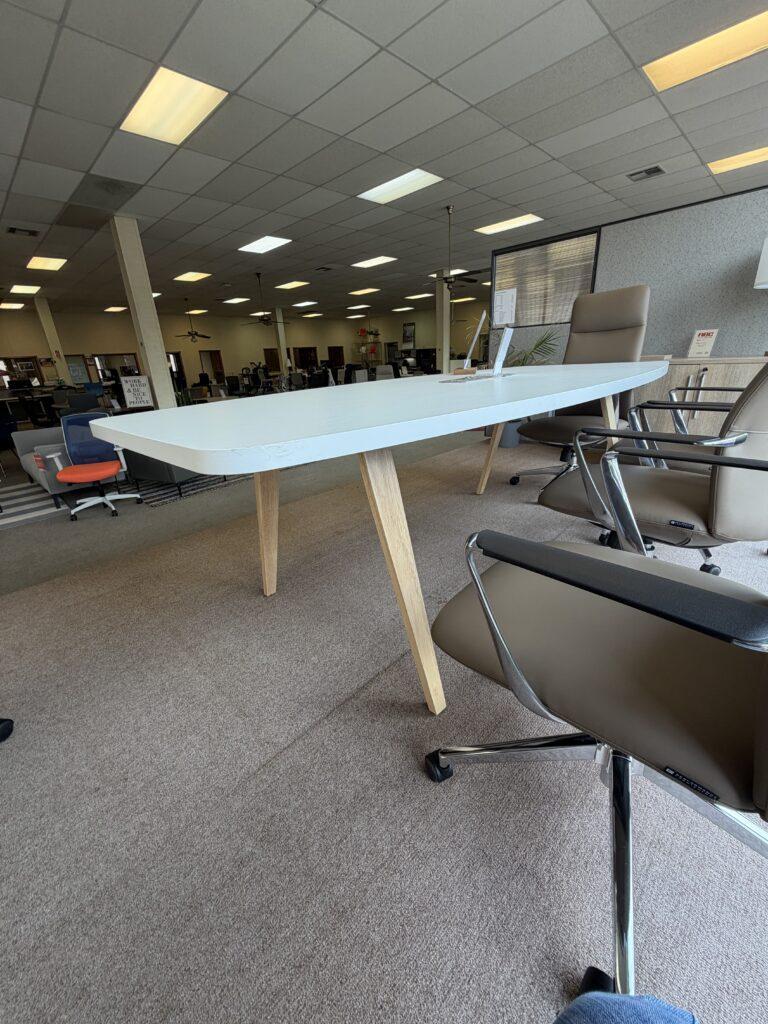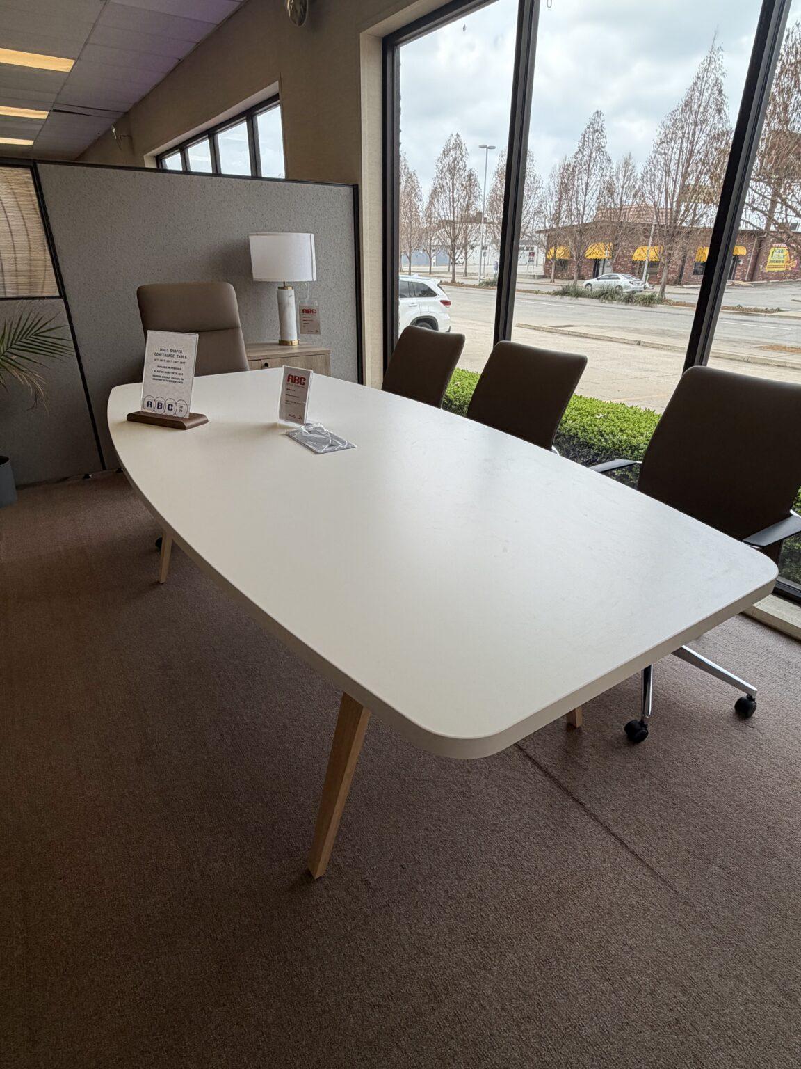 Boat-shaped conference table with a durable laminate top, available in multiple sizes and finishes. Choose black or silver metal legs, or wooden legs in modern walnut, natural, or Newport gray for a stylish, functional meeting space.