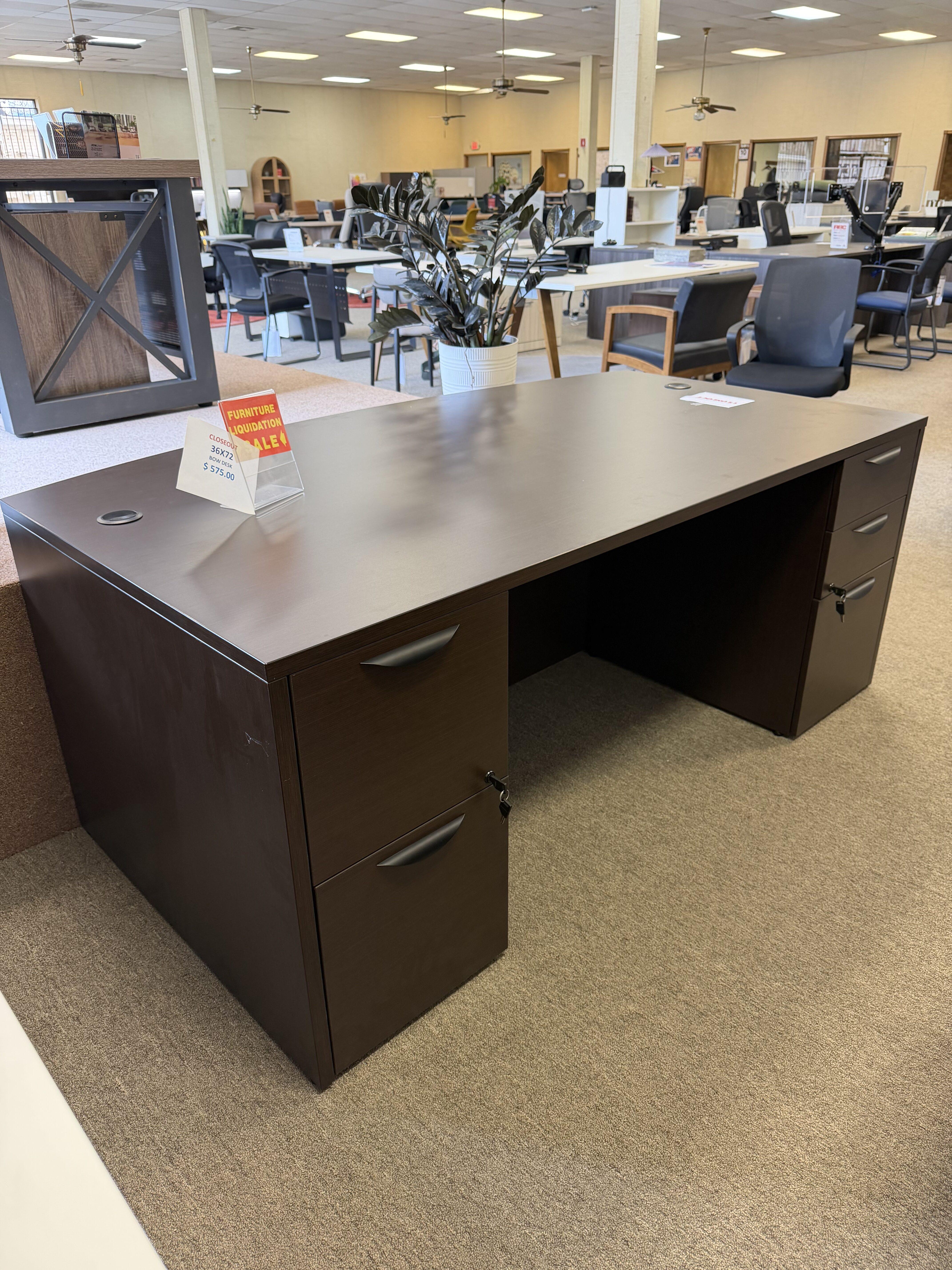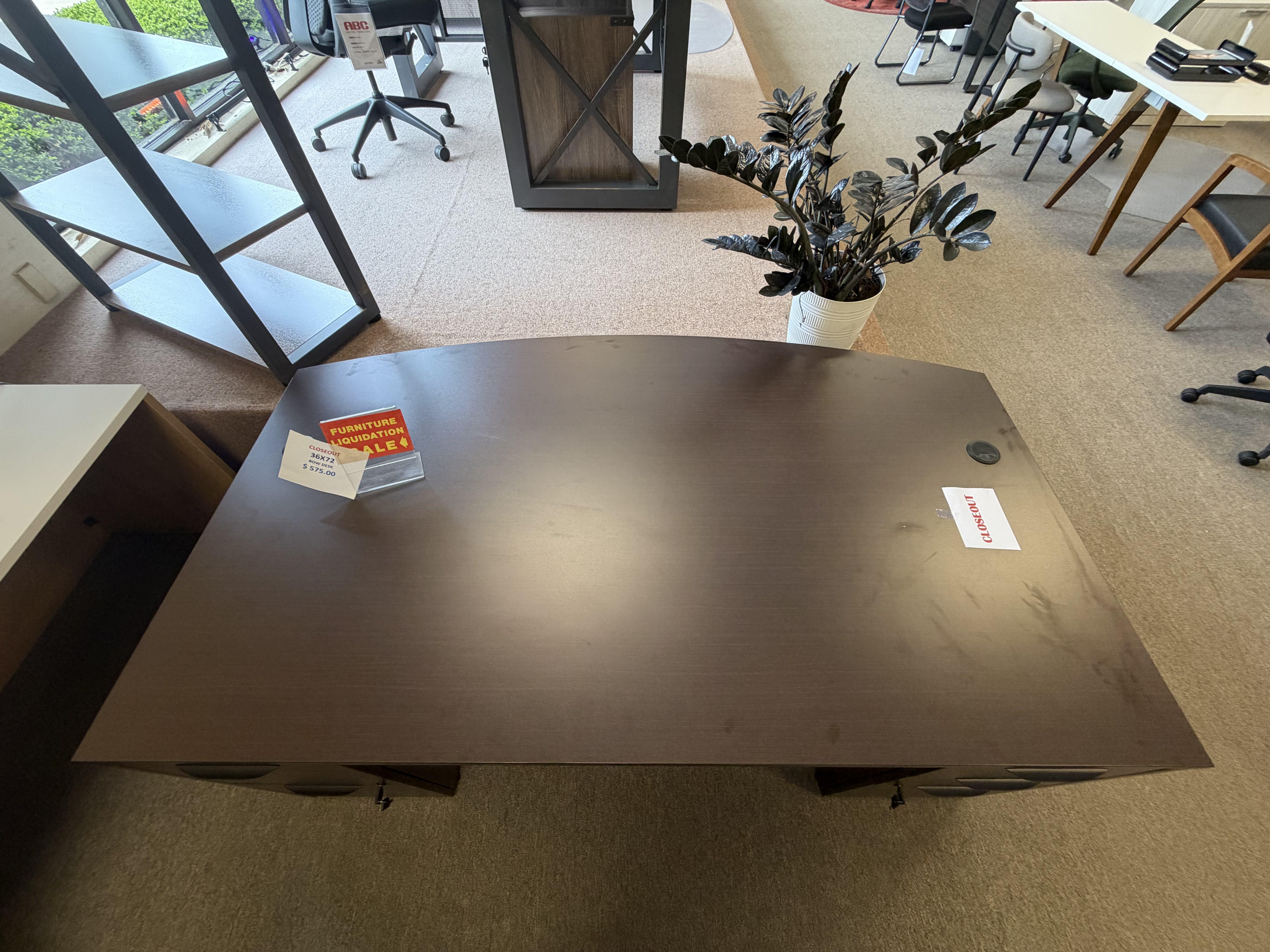 Bow front desk in an espresso laminate finish, featuring built-in grommets for wire management. Includes two storage pedestals—one box/box/file and one file/file—for organized and secure document storage.