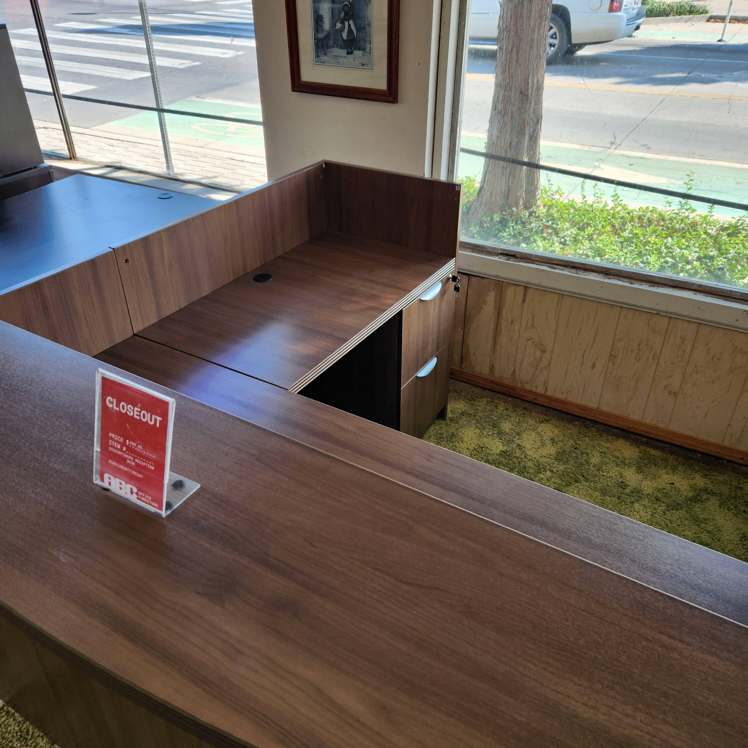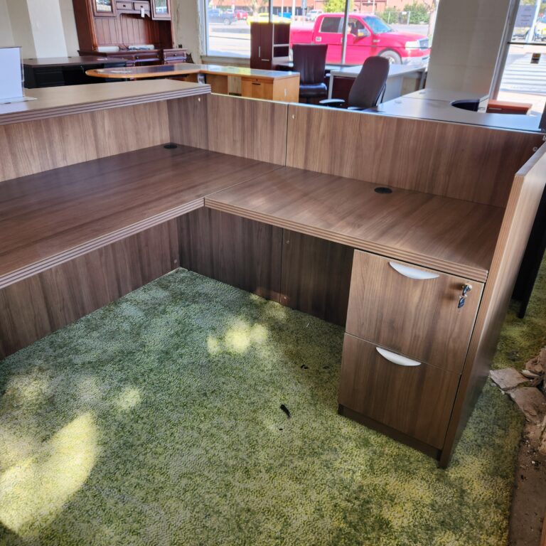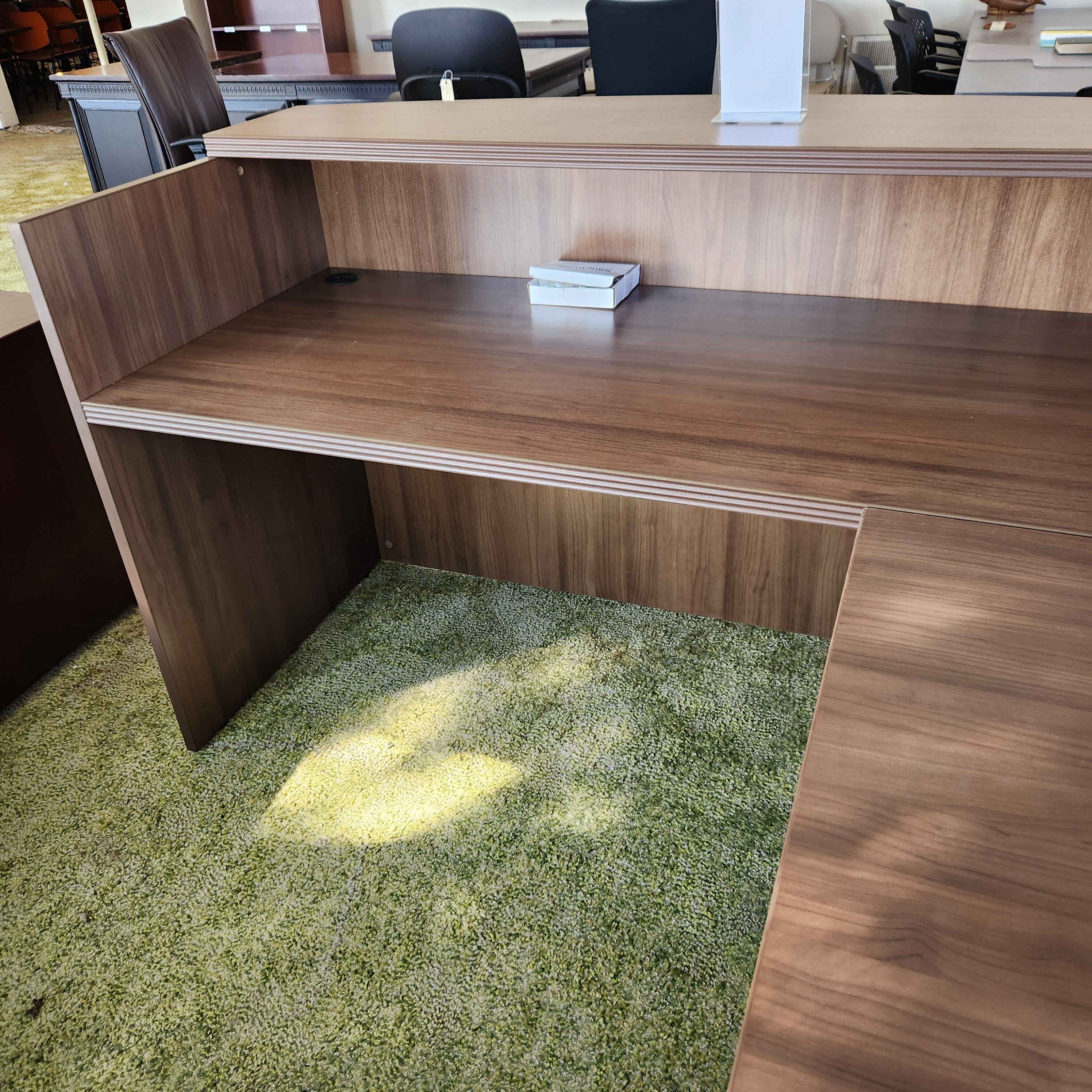 Create a welcoming first impression with this L-shaped laminate reception desk—an ideal blend of function and professional style. The standing-height counter provides a convenient space for greeting clients, while the seated workstation offers ample room to stay organized and productive. With a durable laminate surface and neutral brown finish, this reception desk complements a variety of office looks and delivers long-lasting performance. Perfect for offices, salons, or clinics looking for a polished, efficient setup.