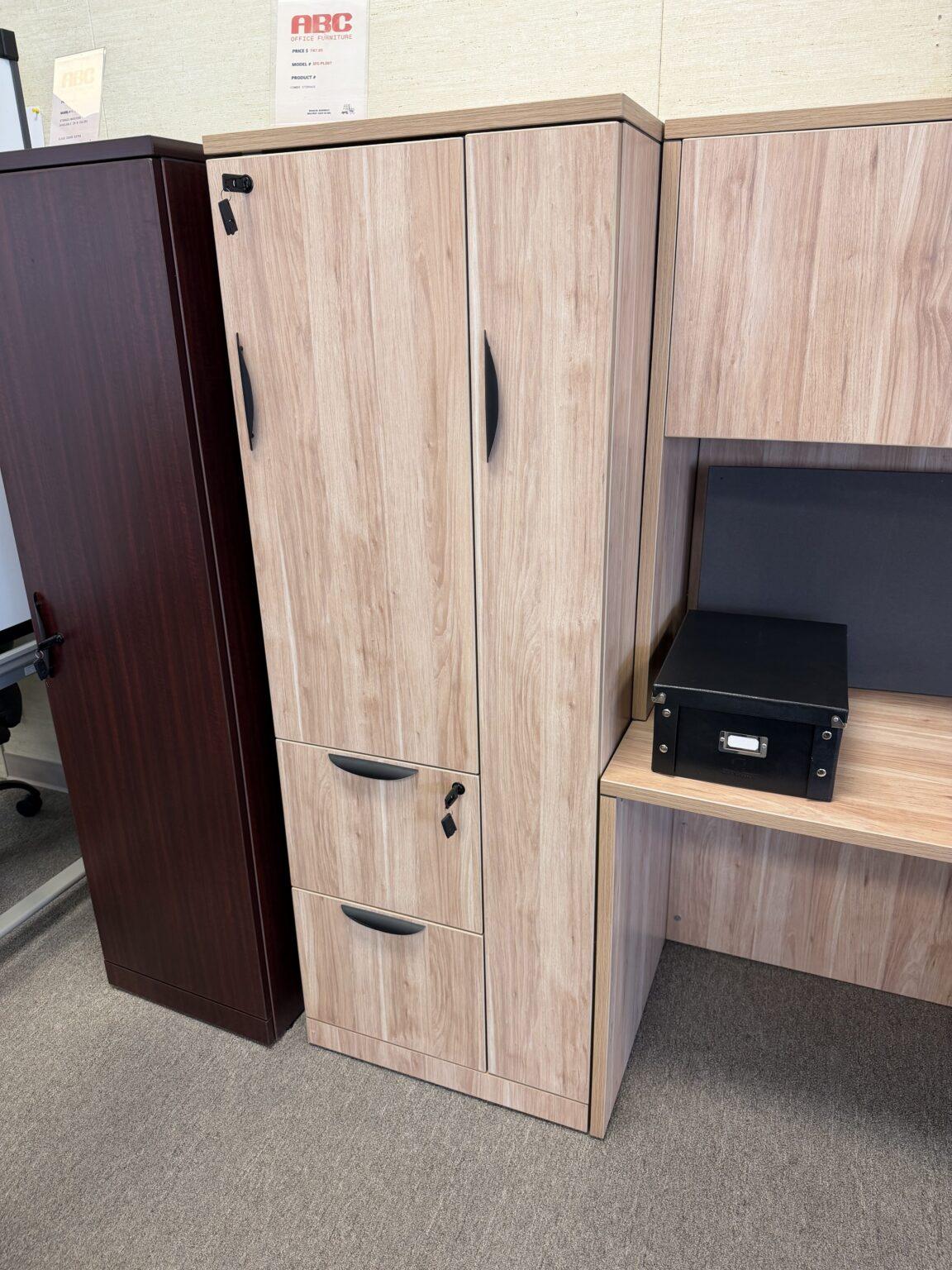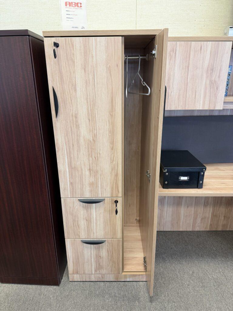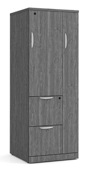 65"H wardrobe featuring two lockable file drawers, a hanging rod for jackets or clothing, and a spacious lockable storage cabinet. A versatile solution for secure storage and personal organization in any office.