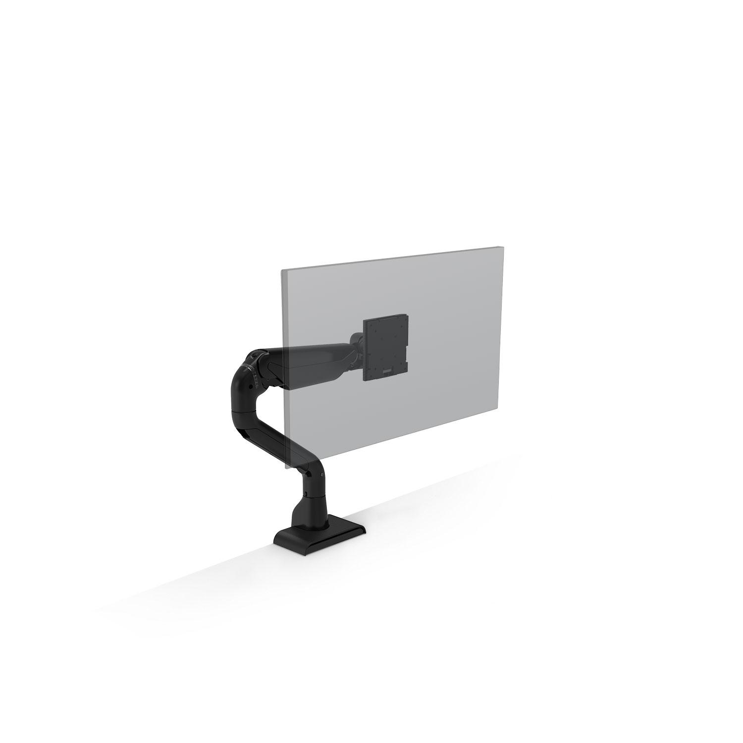 Available in white, black or silver finishes. Height Adjustment: 10.5 in. Mount: C-Clamp, Grommet Pivot: Landscape/Portrait Rotation: Three rotation joints Weight Capacity: 0-25 lbs. Wire Management: Yes
