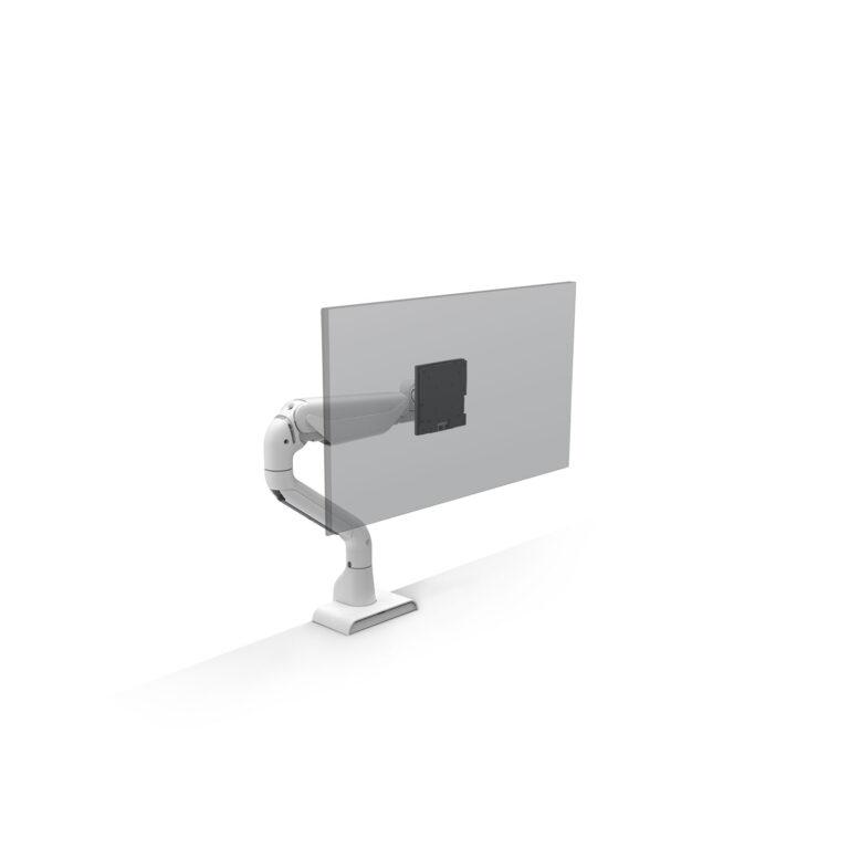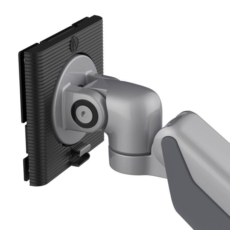 The E5 monitor arm supports large displays up to 49 inches and 25 lbs, making it an ideal choice for expansive modern setups. You can complete the installation quickly thanks to the innovative top-down mount and integrated tool storage. The built-in tension indicator allows for precise pre-counterbalancing, while external rotation stops let you easily adjust the swivel from 90 to 360 degrees. Integrated cable management and quick-disconnect VESA adapters ensure your workspace remains clean and adaptable as your needs change.