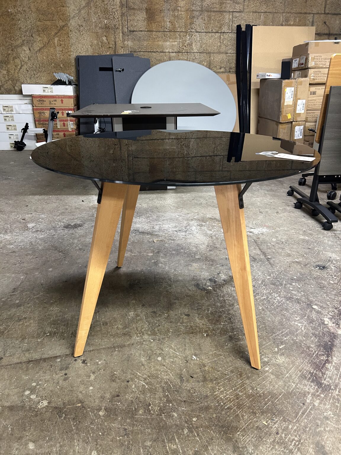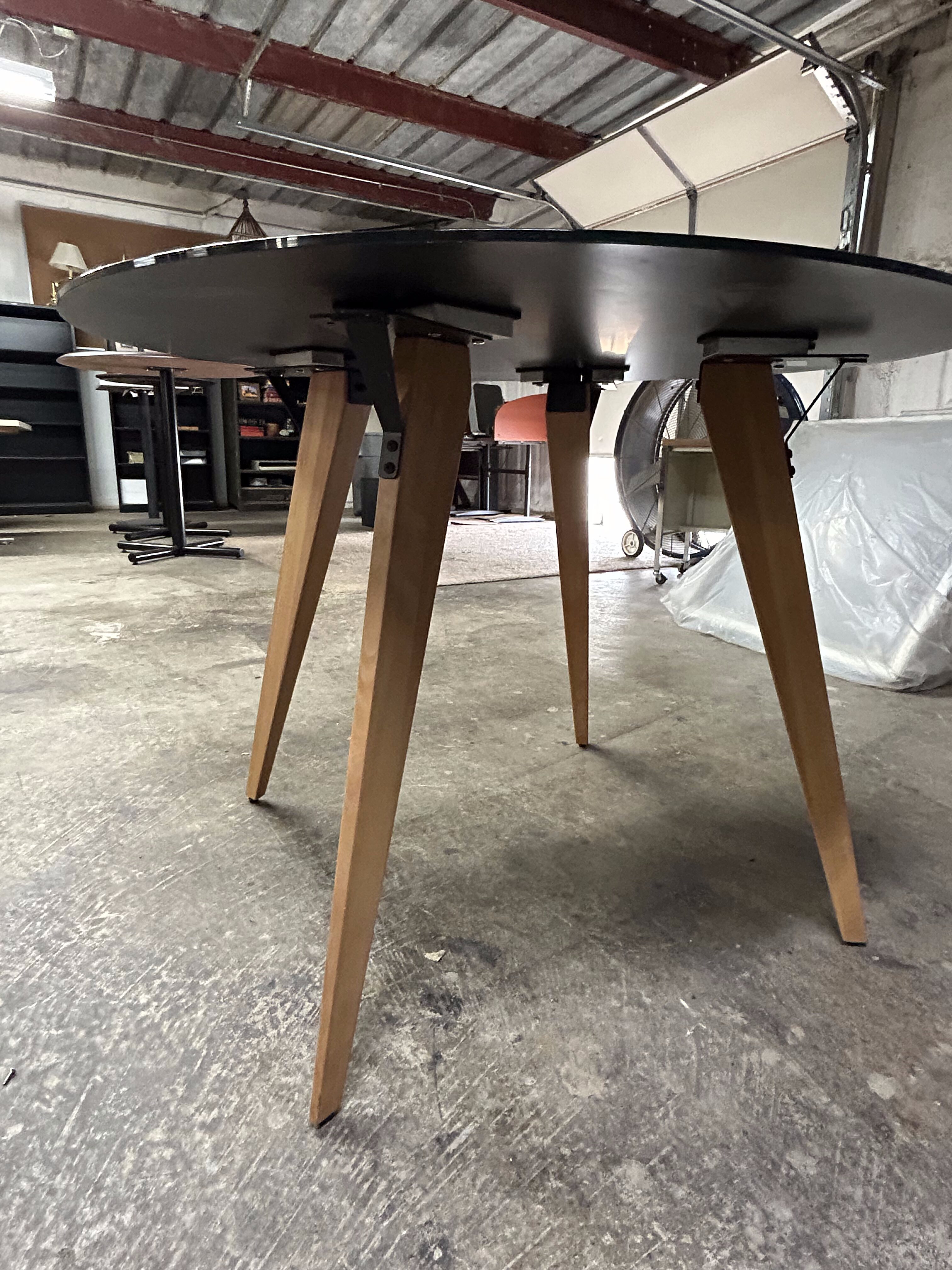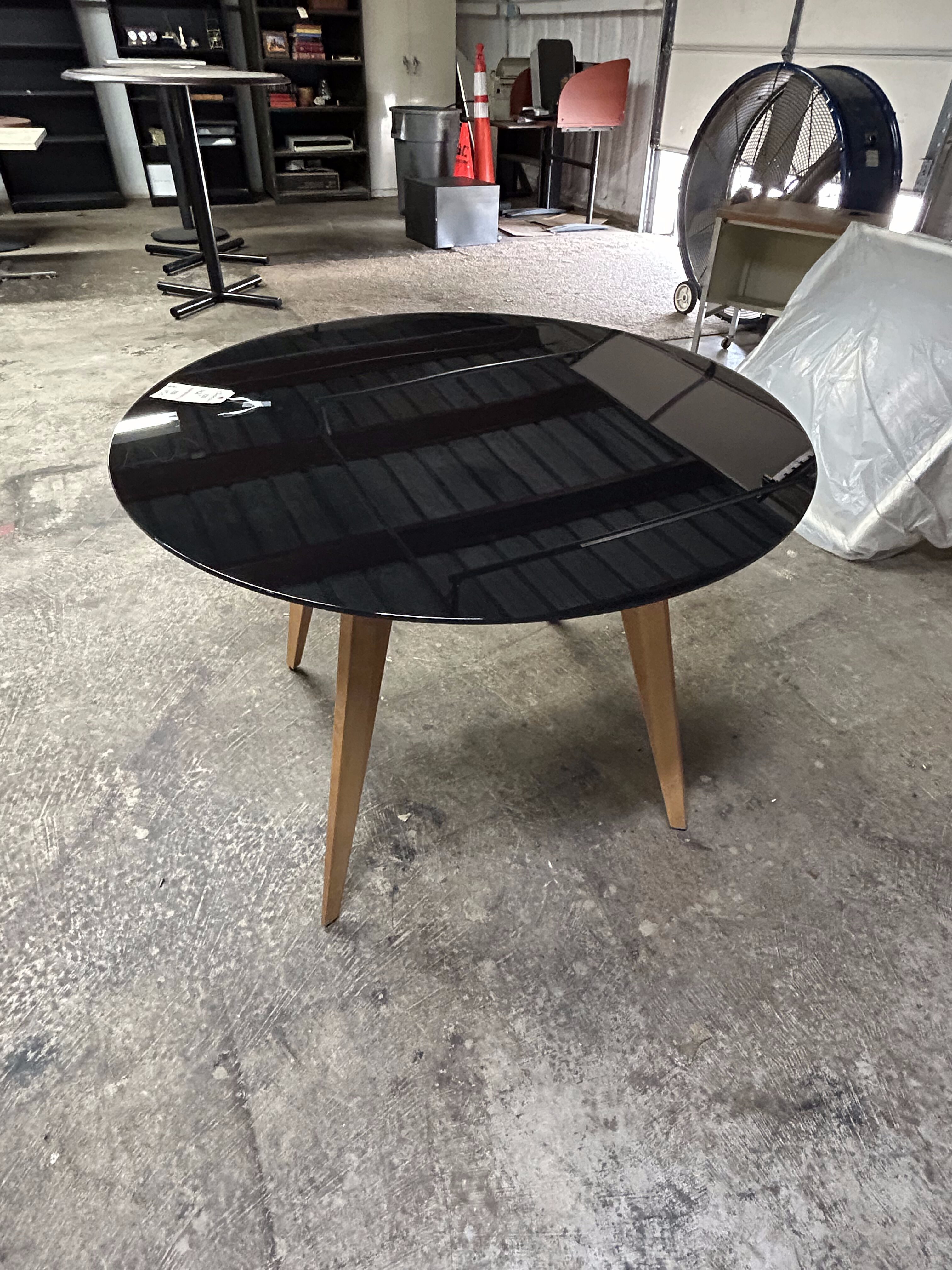 Add a sleek, modern touch to your space with this black glossy table featuring warm wooden legs. Perfect for dining, work, or display, this table blends contemporary elegance with organic charm, making it a versatile addition to any room.