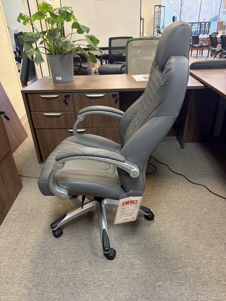 Gray vinyl executive chair with designer-stitched back, pivoting hinge arms, and 2-to-1 synchro tilt with adjustable tension. Seat tilt locks for personalized comfort.