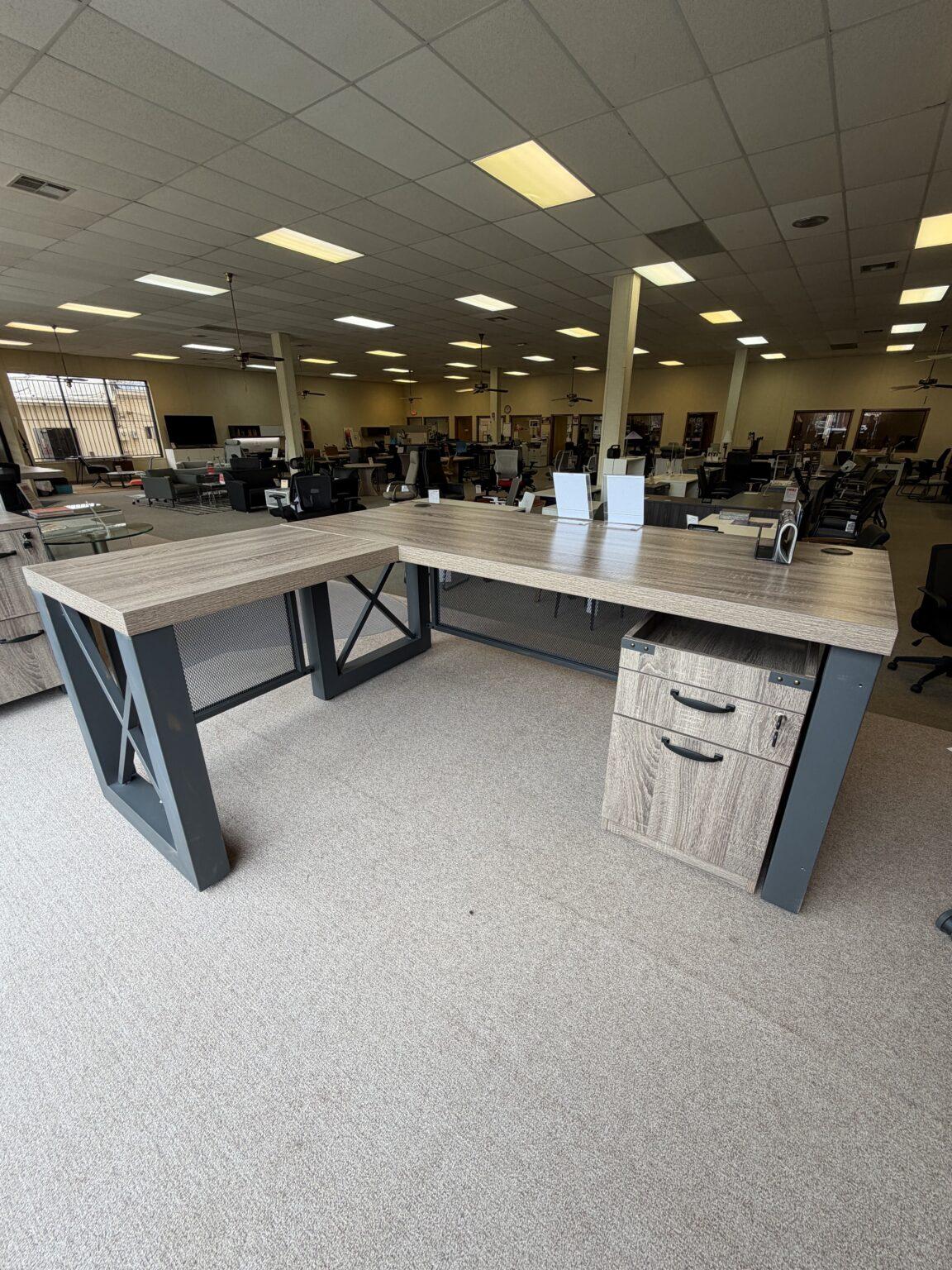 Industrial-style L-shaped desk with distressed laminate surfaces, black metal X legs, a perforated metal modesty panel, and a pedestal with box/file storage for a spacious, functional workspace. Get it while supplies last!