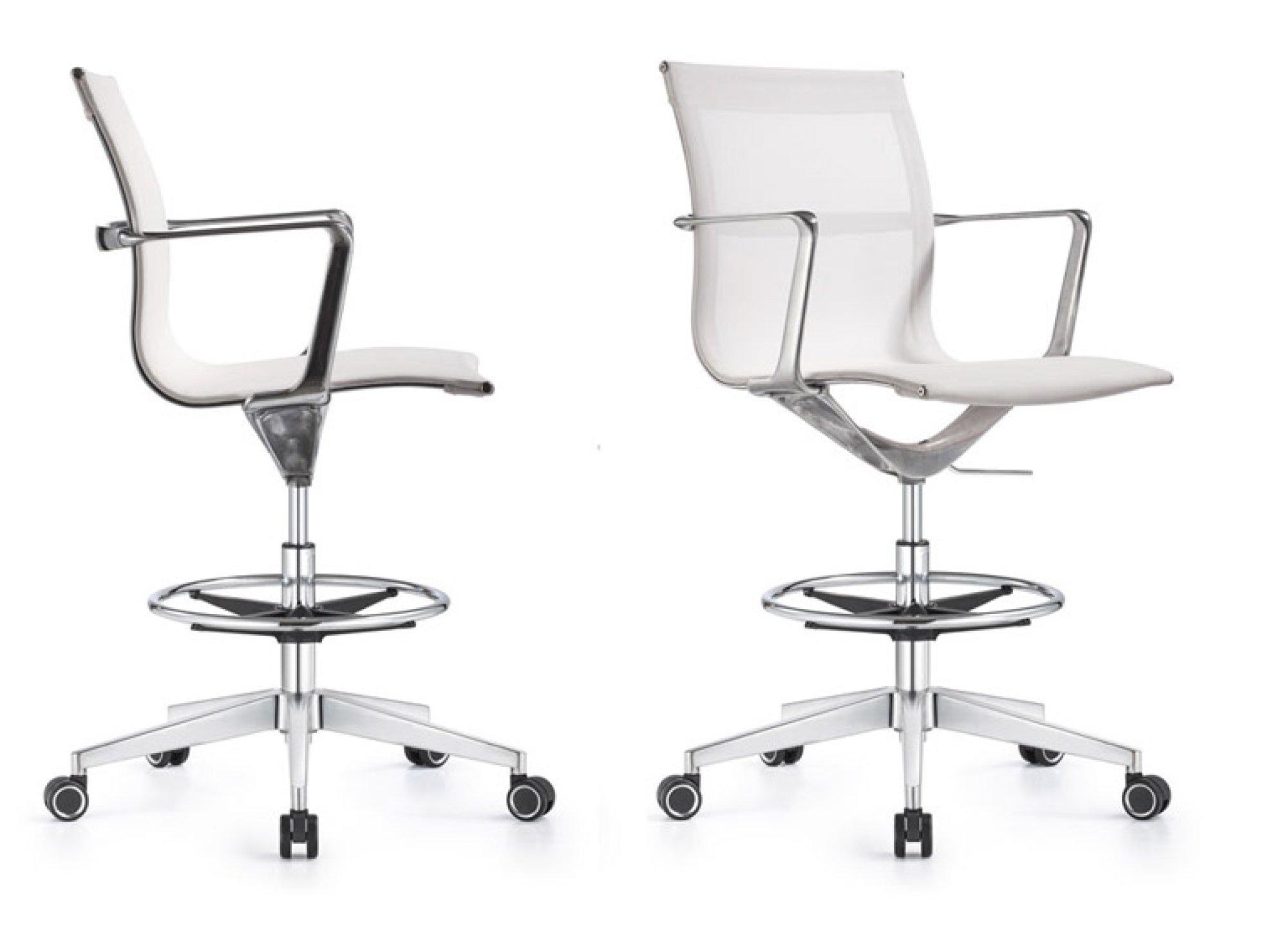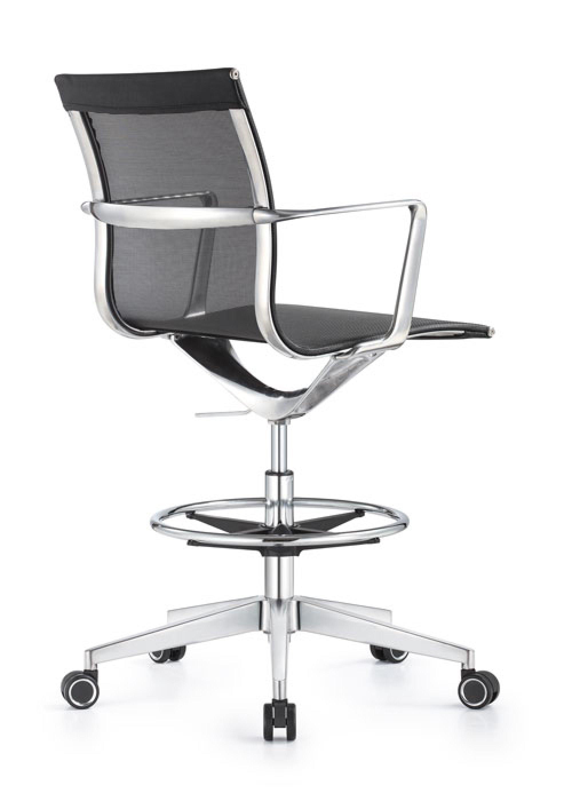 The Joan Stool is a refined, high-performance seating solution perfect for conference rooms, hotel spaces, or elevated workstations. It features a breathable mesh seating surface and a striking ultra-high polished aluminum frame and base that provides a modern, sophisticated look. You can stay comfortable during long tasks thanks to the ergonomic waterfall seat shape and a pneumatic height adjustment that ranges from 24.5 to 32.5 inches. This durable stool is rated for 300 pounds and features a unique arm detail that wraps around the back for added style and support. For maximum stability, it includes an oversized base and dual-purpose 60mm casters in black with a polished silver ring.