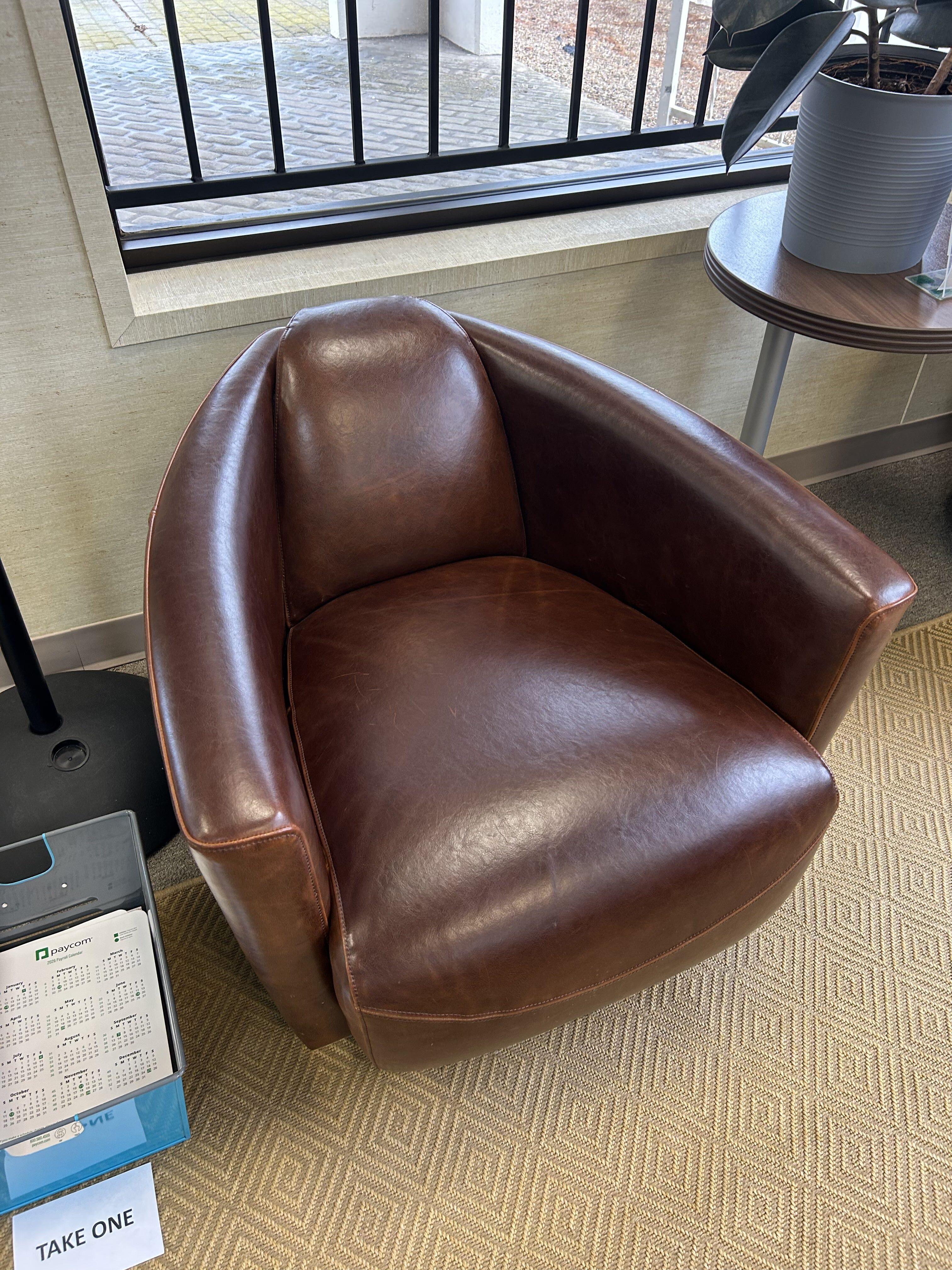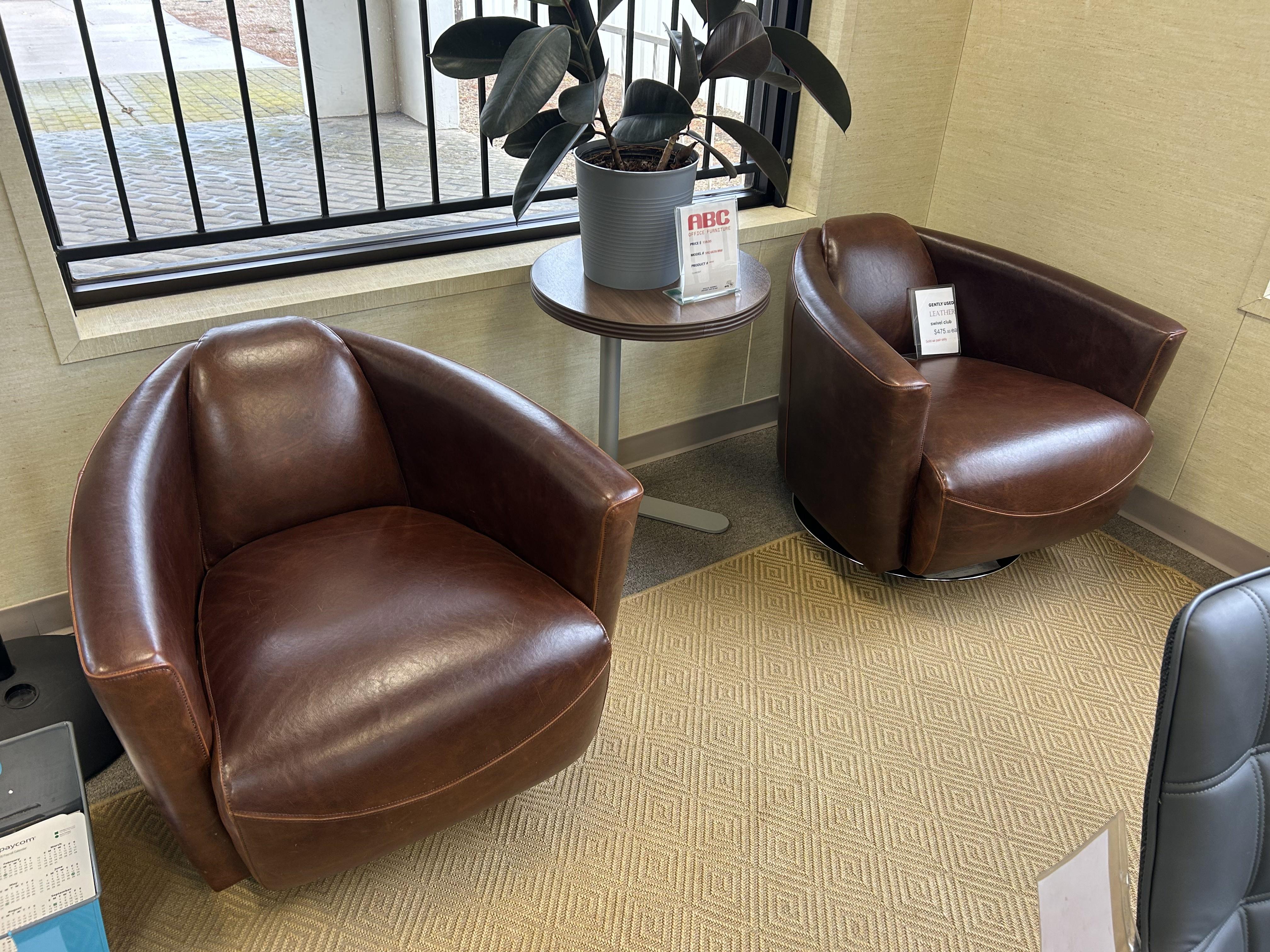 Set of two compact brown leather swivel lounge chairs, combining style and comfort. Perfect for living rooms, offices, or cozy seating areas, adding elegance and versatility to any space.
