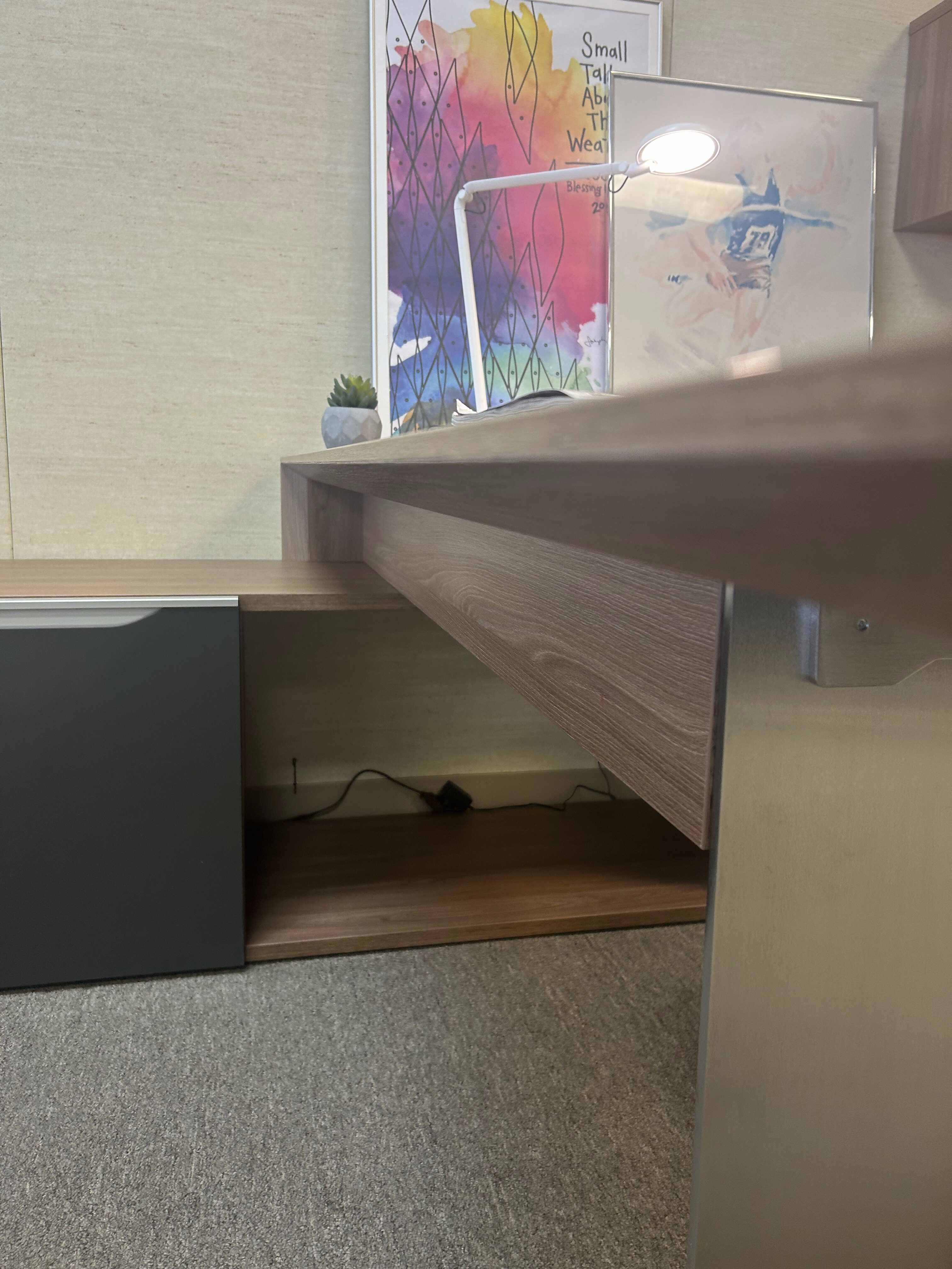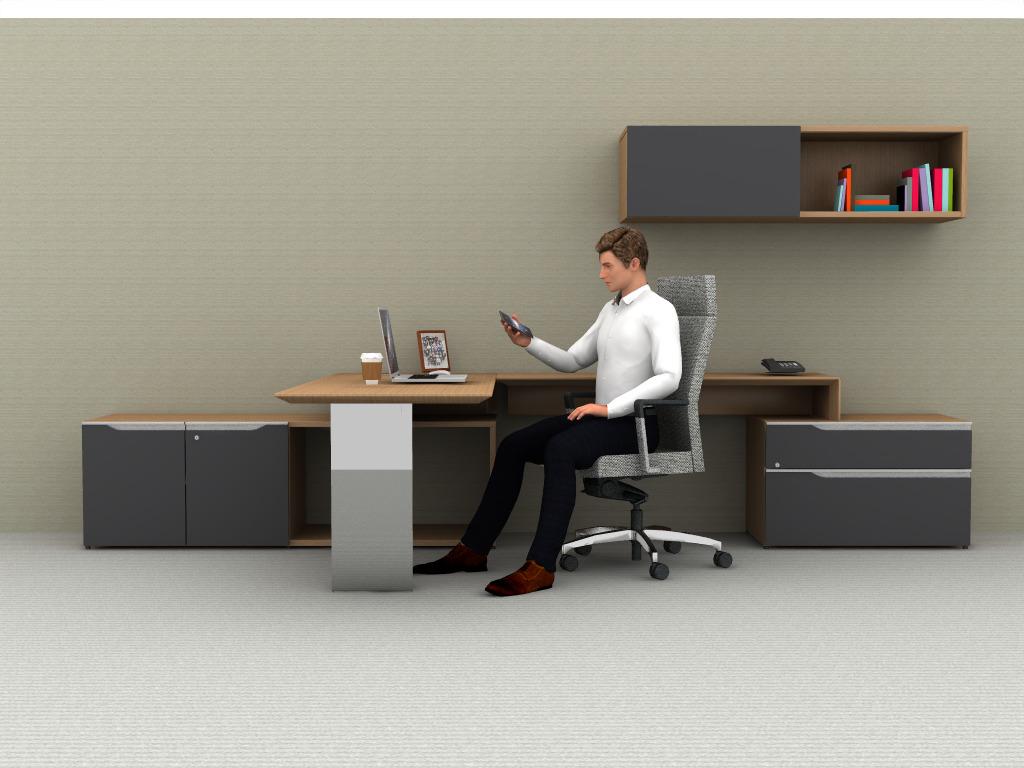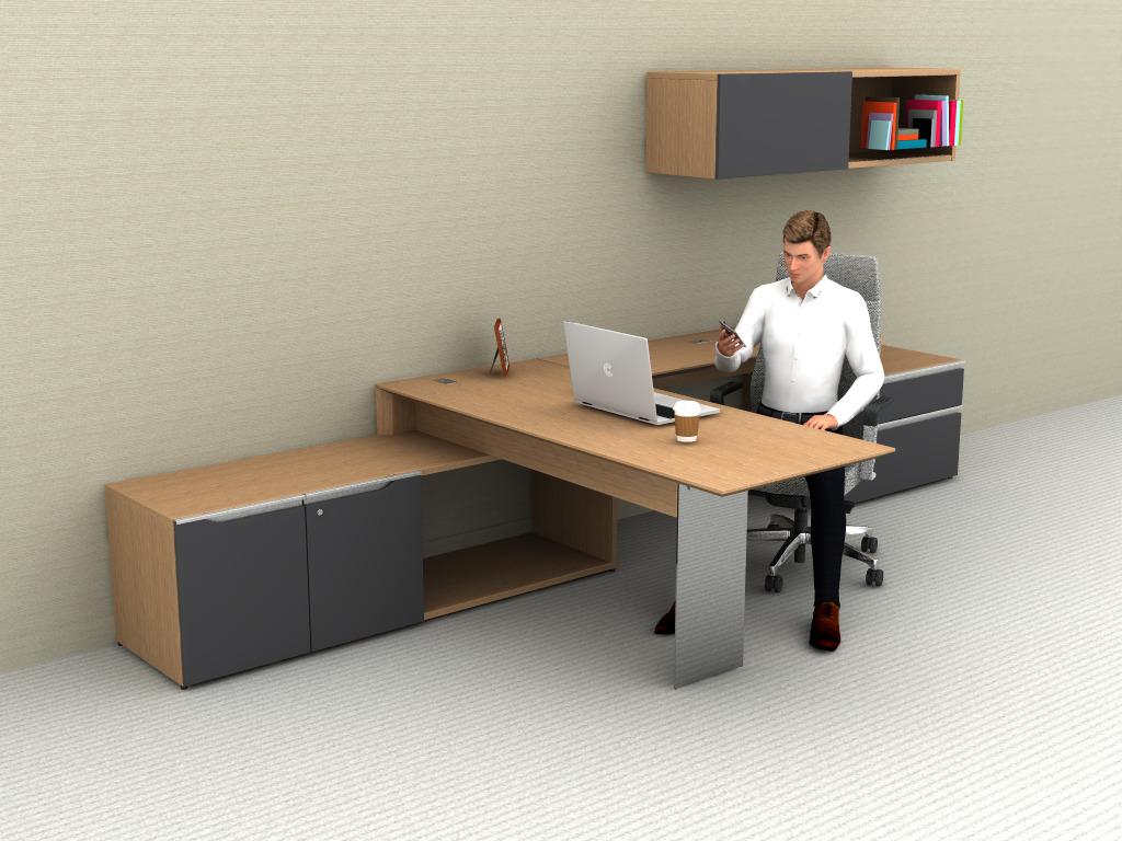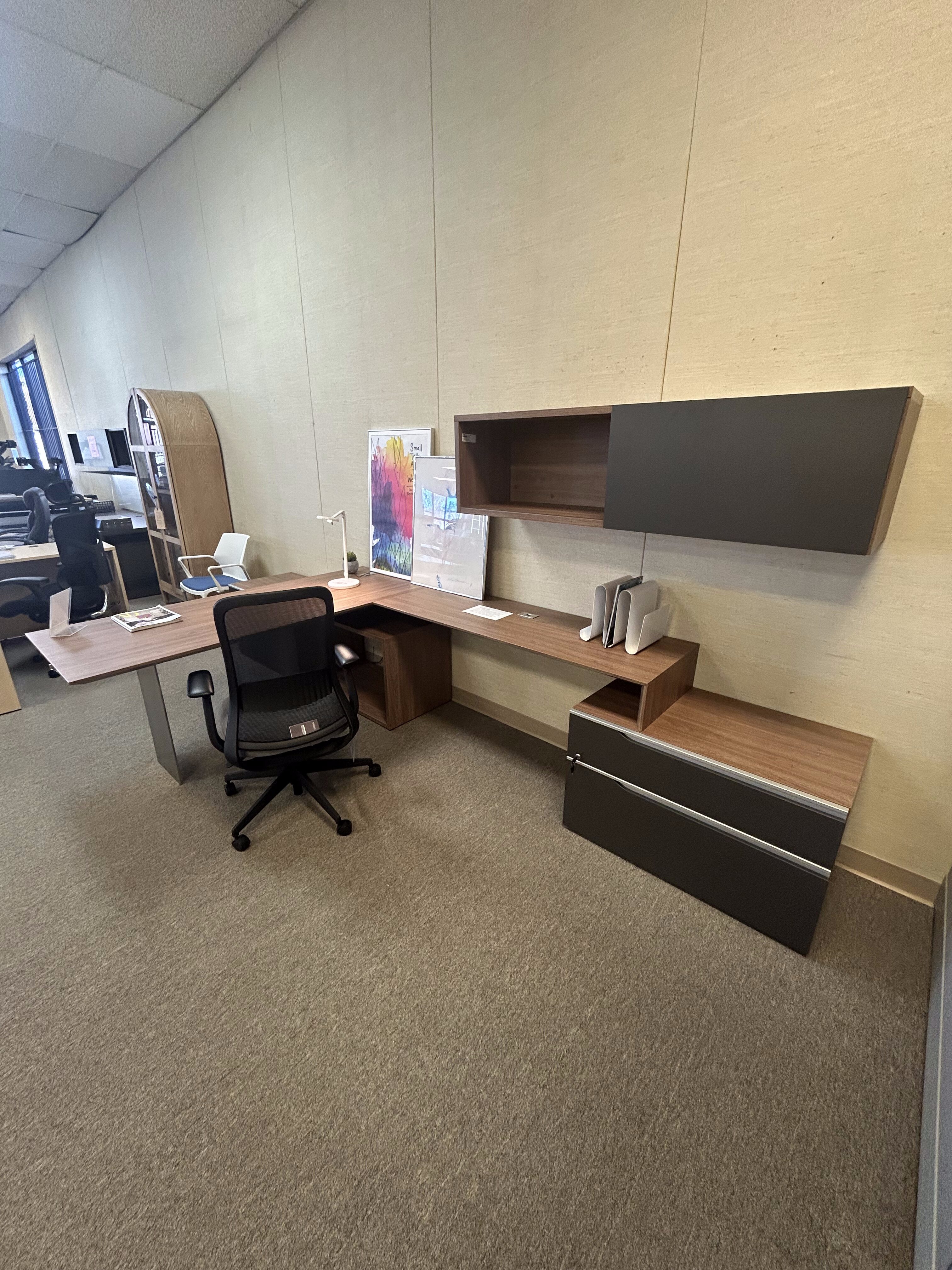 A contemporary executive desk with quality finishes, integrated storage, and balanced proportions—designed to elevate everyday office spaces. This set up is customizable. Come see us in store for pricing.